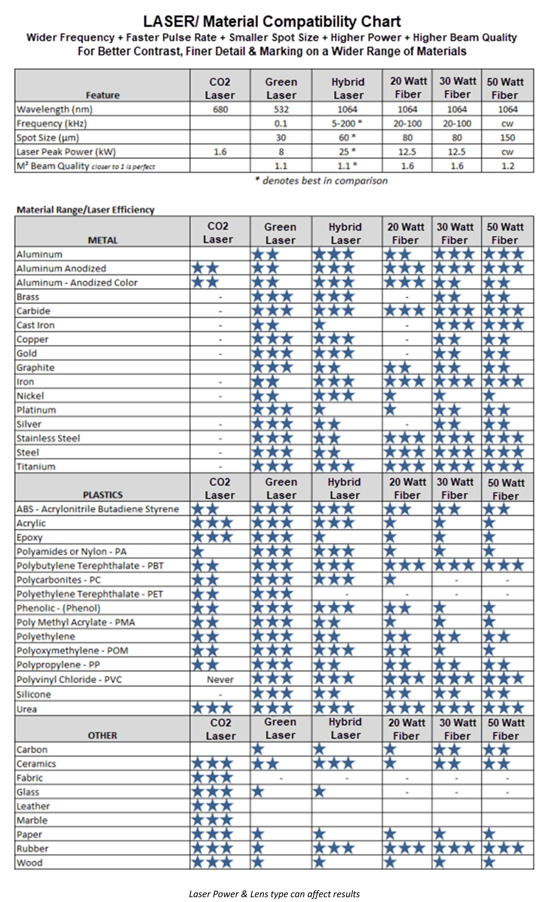 Engrave & Cut: Engravable Plastics (available from Gravotech) • Stainless Steel* • Brass* • Aluminum* Anodized Aluminum • Coated Metals • Wood • Glass • Leather • Paper • Fabric • Marble • Granite • Crystal • Rubber • Ceramic • Backs of Mirrors • Acrylic and much more…